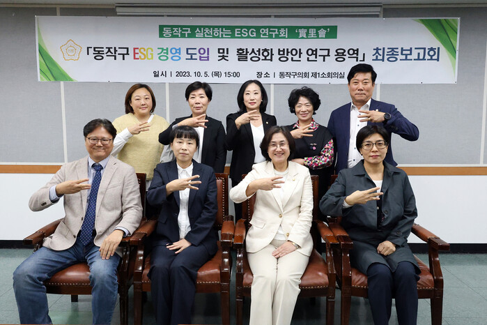 [시민일보 = 여영준 기자] 서울 동작구의회(의장 이미연) 의원 연구모임 ‘동작구 실천하는 ESG 연구회 ‘實里會’가 최근 구의회 제1소회의실에서 ‘동작구 ESG 경영 도입 및 활성화 방안 연구 용역’ 최종보고회를 개최했다.