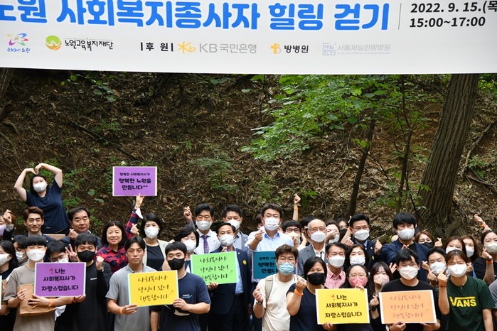 오승록 서울 노원구청장은 지난 15일 지역내 민간 복지시설 20곳의 종사자들을 격려하기 위해 수락산 무장애숲길에서 열린 노원 사회복지 종사자 힐링 걷기 행사에 참석했다. 사진은 행사에 참석한 오 구청장(가운데)이 기념촬영을 하고 있는 모습.(사진제공=노원구청)