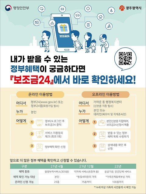 이와 관련, 광주시는 많은 시민들이 서비스를 이용할 수 있도록 동 행정복지센터에 서비스 전담 창구를 운영하고 각종 게시판 및 전광판, 소셜네트워크서비스(SNS) 등 다양한 매체를 활용해 보조금24를 홍보할 계획이다.