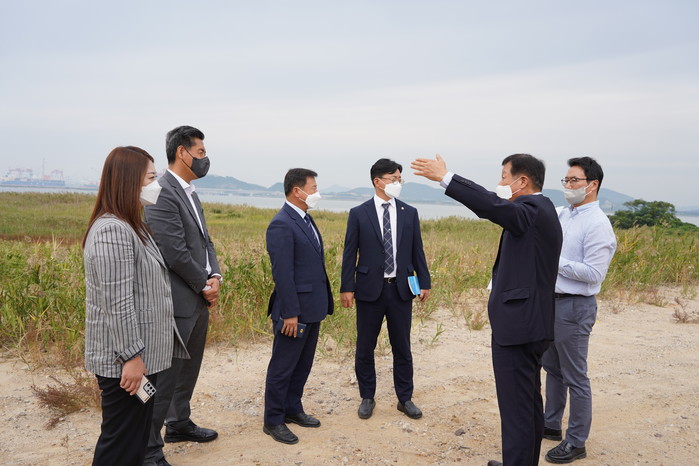 | ▲ 박상정 해남군의회 국립해양수산박물관 유치 특별위원회 부위원장(사진 가운데)이 28일 해남군 산이면 소재 서남해안기업도시개발(주) 솔라시도 내 부지 예정지 현지를 방문해 관계자들과 국립해양수산박물관 유치에 대한 의견을 교환하고 있다. / 해남군의회 제공 |