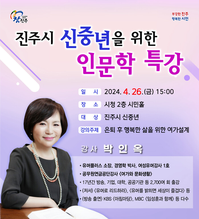 진주시는 오는 26일 오후 3시 시청 시민홀에서 신중년 문화확산을 위해 박인옥 유머플러스센터 소장을 초빙하여 ‘은퇴 후 행복한 삶을 위한 여가설계’라는 주제로 신중년 대상 인문학 특강을 개최한다.