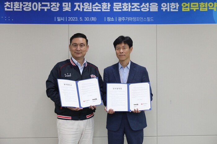 [광주=정찬남 기자] 광주광역시(시장 강기정)는 30일 오후 KIA타이거즈주식회사(단장 심재학)와 광주기아타이거즈챔피언스필드에서 ‘친환경 야구장 및 자원순환 문화조성을 위한 업무협약’을 체결했다.