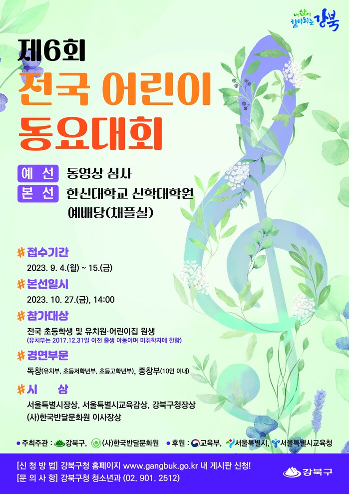 [시민일보 = 홍덕표 기자] 서울 강북구(구청장 이순희)가 오는 10월27일 한신대학교 신학대학원 예배당에서 '전국 어린이 동요대회'를 개최한다.