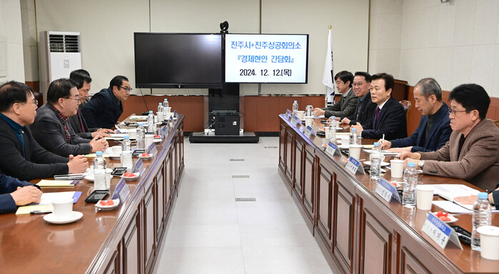 진주시는 12일 진주상공회의소에서 조규일 시장, 허성두 진주상공회의소 회장을 비롯한 임원진 등 15명이 참석한 가운데 지역경제 현안 간담회를 개최했다.