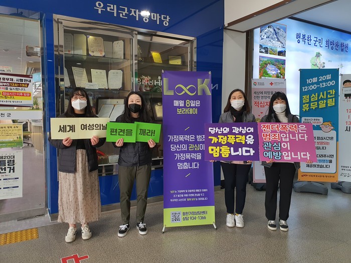 합천군(군수 문준희)와 합천가정상담센터(센터장 송민숙)은 8일 보라데이를 맞이하여 합천군청, 합천군종합사회복지관 등에서 홍보 캠페인을 진행했다.