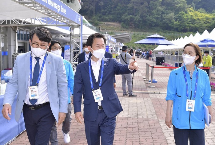 [광주=정찬남 기자] 문영훈 광주광역시 행정부시장이 20일 오후 남구 광주국제양궁장을 방문해 광주 2022 양궁월드컵대회 관계자들을 격려한 뒤 경기장을 둘러보고 있다./광주광역시 제공