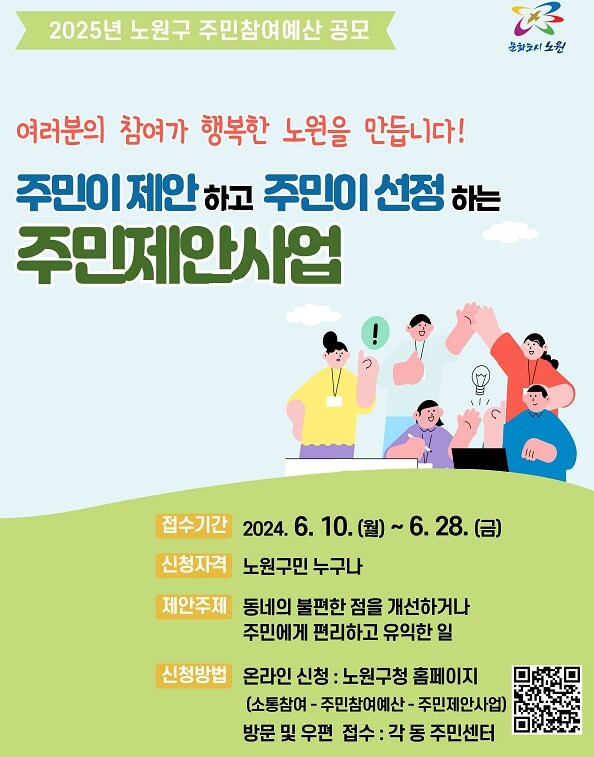 [시민일보 = 변은선 기자] 서울 노원구(구청장 오승록)는 오는 2025년도 주민참여예산 편성을 위해 '노원구 주민제안사업' 공모 접수를 10일부터 받는다.