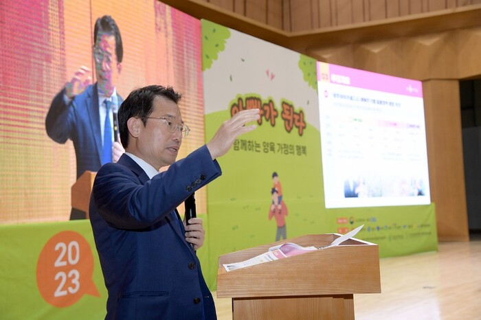 | ▲ 문영훈 광주광역시 행정부지사가 17일 오후 전남대학교 민주마루에서 열린 보건복지부와 광주CBS가 주최·주관하는 출생돌봄 캠페인 ‘2023 육아포럼 〈아빠가 된다〉 in 광주’ 에서광주시 육아정책 소개(PPT), 를 하고 있다. / 광주광역시 제공 |