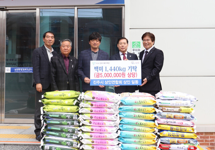 진주시 상인연합회(회장 김영주)는 회장 이·취임식을 맞아 6일 회원들의 축하 속에 전달받은 백미 1,440kg(10kg, 144포, 환가액 500만 원 상당)을 지역의 어려운 이웃에게 전달해 달라며 진주시복지재단(이사장 이성갑)에 기탁했다.