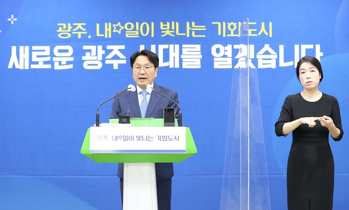 | ▲ 강기정 광주광역시장이 25일 오후 시청 5층 브리핑룸에서 ‘보호종료아동 지원방안 관련’ 기자회견을 하고 있다./광주광역시 제공 |