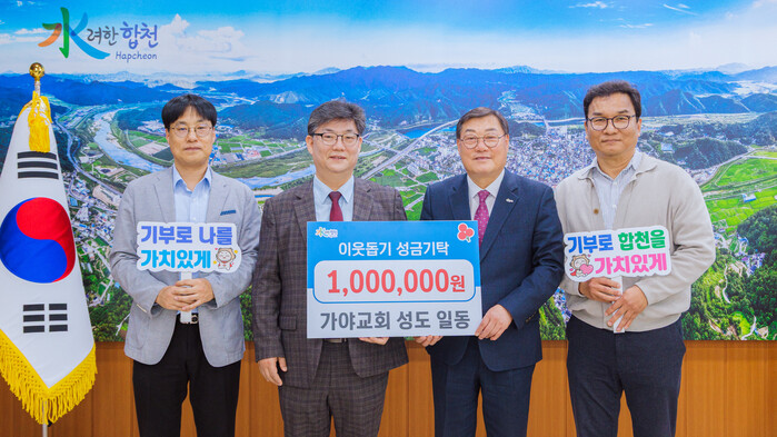 김윤철 합천군수는 "이웃을 위하는 따뜻한 마음으로 나눔을 실천해주신 가야교회 목사님과 성도 여러분께 깊은 감사의 인사를 전한다"며 "성금은 꼭 필요한 이웃에게 전달될 수 있도록 하겠다"고 말했다.