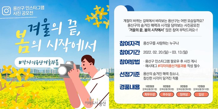 남녀노소 누구든지 오는 3월13일까지 구 인스타그램을 팔로우한 후 해시태그 '#각자의용산겨울과봄'을 적고 사진을 게시하면 된다.