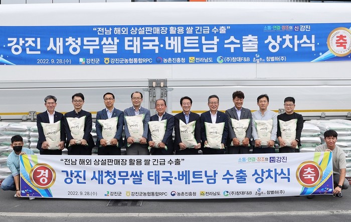 강진군은 28일 국내 쌀시장의 불안을 극복하고, 지역 쌀 산업의 발전을 도모하고자 군·도·농협·수출업체 관계자들이 참석한 가운데 강진군농협 통합RPC에서 새청무쌀 수출 상차식을 진행했다.