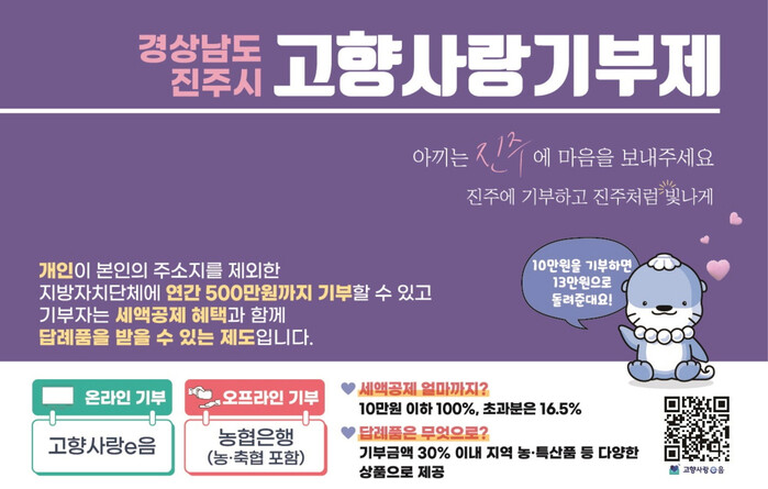 연말정산 시즌이 다가오며 고향사랑기부 참여가 더욱 활발해지는 가운데, 진주시는 연말까지 다양한 온·오프라인 홍보를 통해 더 큰 성과를 달성하고, 기부자의 선의에 보답하는 시민이 행복한 부강한 진주를 만들어 갈 계획이다.
