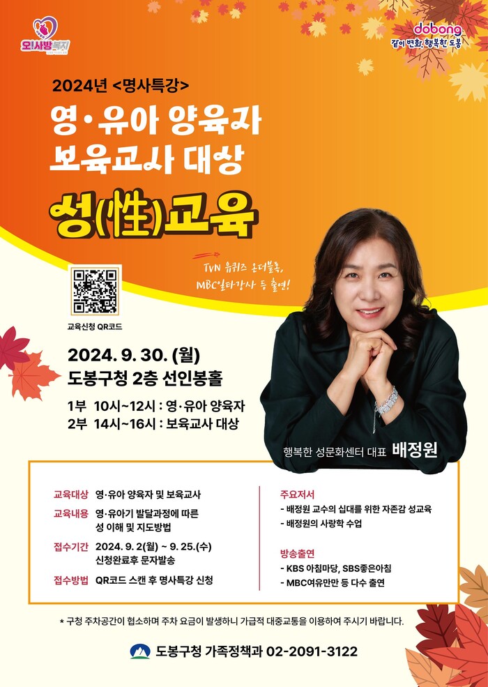 오언석 도봉구청장은 “이번 성교육으로 영유아의 올바른 성인식을 위한 양육자 역할에 대해 유익한 정보를 얻고, 평소 아동의 성과 관련된 모든 고민과 궁금증을 해결하길 바란다”고 말했다.