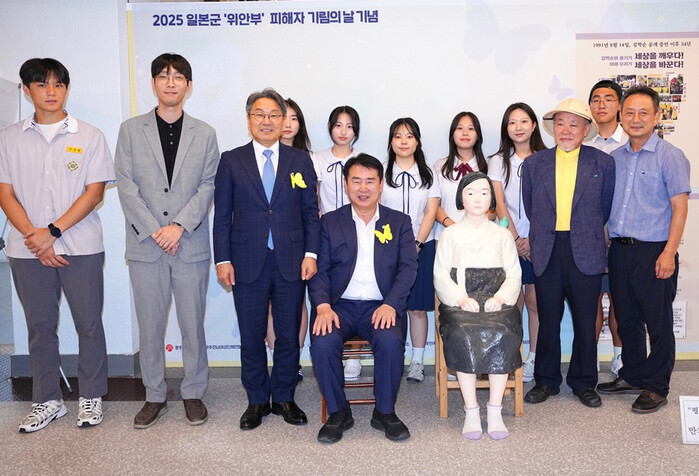 [광주=정찬남 기자] 강기정 광주광역시장(앞줄 왼 쪽부터 세 번쨰)이 13일 오후 전일빌딩245에서 열린 '일본군 위안부 피해자 기림의날' 행사에 참석해 학생들과 기념촬영을 하고 있다. /광주광역시 제공