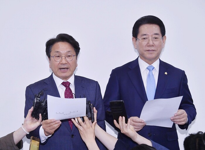 | ▲ 강기정 광주광역시장과 김영록 전남도지사가 10일 오후 서구 김대중컨벤션센터에서 광주군공항 이전 추진 관련 광주광역시·전라남도 공동 발표문을 취재진에 공개하고 있다./광주광역시 제공 |