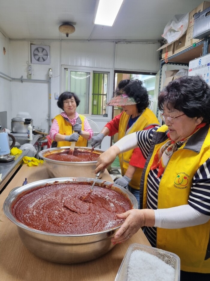 서울 강서구 화곡본동주민센터에 지역내 거주하는 86세 노인이 화곡본동자원봉사캠프 활동가들에게 직접 찹쌀고추장과 밑반찬을 받은 데 대한 감사인사를 전하는 편지를 전달했다. 사진은 자원봉사자들이 직접 고추장을 담그고 있는 모습.(사진=강서구청 제공)