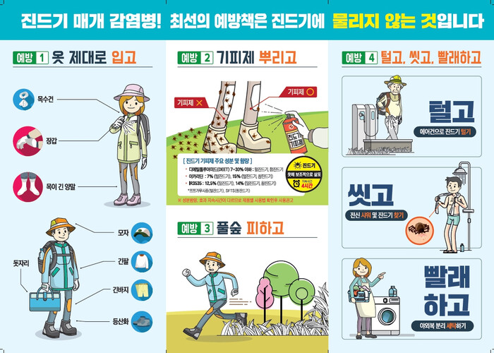 보건소 관계자는 “진드기 매개 감염병은 예방백신이 없어 야외활동 시 ▶긴소매, 긴바지, 모자 등으로 피부 노출 최소화하기 ▶4시간 간격으로 기피제 사용하기 ▶풀숲에 들어가지 않기 ▶귀가 후 즉시 목욕 및 옷 세탁 등의 예방수칙을 지키는 것이 중요하다.”고 말했다.