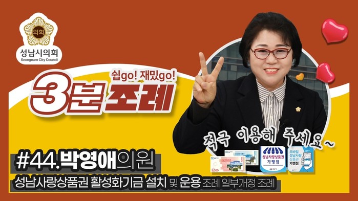 [성남=오왕석 기자] 성남시의회(의장 윤창근)는 10일 ‘성남시의회 3분 조례’ 마흔네 번째 영상을 시의회 공식 SNS에 게시했다.