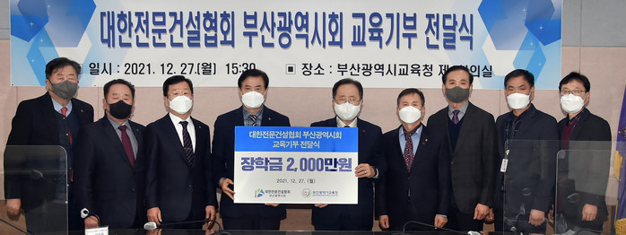 부산광역시교육청(교육감 김석준)은 12월 27일 오후 3시 30분 교육감실에서 대한전문건설협회 부산시회(회장 김세원)로부터 교육기부금 2,000만원을 전달받았다.