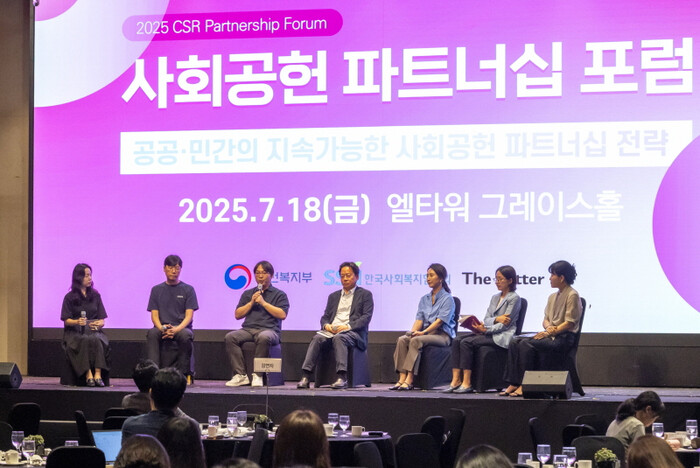 | 2025 사회공헌 파트너십 포럼에 참석한 패널들이 기업과 공공의 사회공헌 협력 방안에 대해 토론을 하고 있다. |