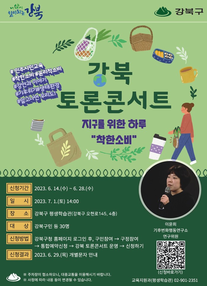 콘서트는 '착한소비'를 주제로 소비의 의미, 착한 소비활동의 예시, 활성화 방안 등을 기후변화행동연구소 연구위원 이윤희 강사가 약 30분간 강연하며, 이후 약 50분간 참여한 구민들과 함께 토론하는 의견나누기 시간이 이어진다.