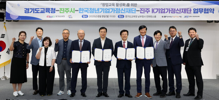 진주시와 진주 K-기업가정신재단은 9일 경기도교육청 남부청사에서 경기도교육청, 한국청년기업가정신재단과 K-기업가정신 확산과 창업 체험 및 교육 활성화를 위한 4자 간 업무협약(MOU)을 체결했다고 밝혔다.