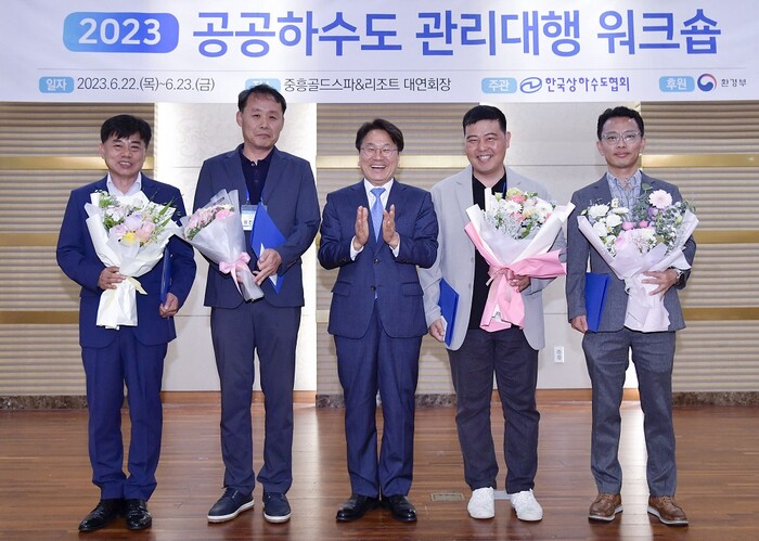 [광주=정찬남 기자] 강기정 한국상하수도협회장(광주광역시장 / 가운데)이 22일 오후 전남 나주시 중흥골드리조트에서 열린 '2023 공공하수도 관리대행 워크숍'에 참석해 유공자 표창을 한 뒤 기념촬영을 하고 있다./광주광역시 제공