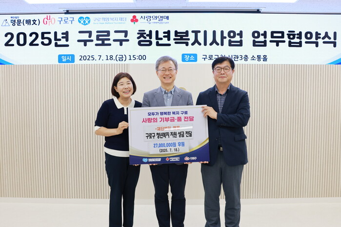 장인홍 구청장은 “지역 청년의 자립을 위해 지속적으로 나눔을 실천하고 계신 명문재단에 깊은 감사를 드린다”며 “구로구는 앞으로도 민간과의 협력을 통해 청년들이 희망을 갖고 성장할 수 있는 복지 기반을 강화해 나가겠다”고 밝혔다.