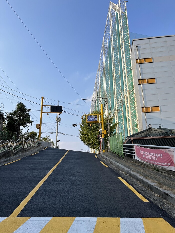 AI 카메라가 전방 40미터까지 자동차, 보행자 등 객체를 인식한 뒤, 영상 전광판으로 운전자에게 언덕과 골목길 상황을 알려준다. ‘전방 보행자 조심’이라는 문구까지 표출돼 운전자가 주위를 살피기에 좋다.