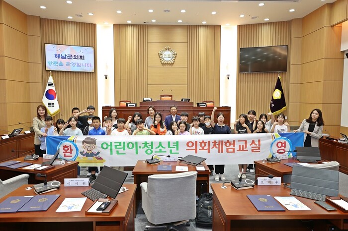 [해남=정찬남 기자] 전남 해남군의회(의장 김석순)는 23일 해남서초등학교 학생들이 참여한 제7회 해남군의회 어린이·청소년 의회체험교실을 본회의장에서 진행했다.