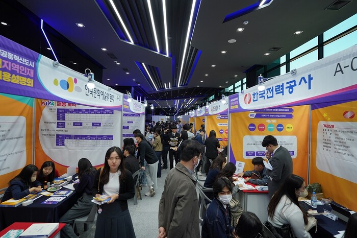 27일 조선대학교 해오름관에서 열린 채용설명회에는 한국전력공사, 한전KDN, 한국농어촌공사 등 12개 광주전남공동혁신도시 이전 공공기관과 광주은행, 앰코테크놀로지코리아, 한국알프스 등 지역기업, 광주지방고용노동청, 한국산업인력공단 광주지역본부 등 지역 유관기관이 참여했다.