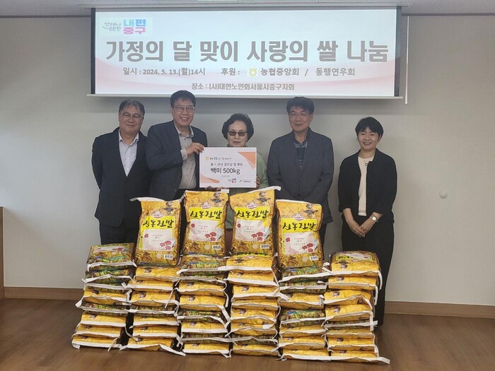 (사) 동행연우회가 서울 중구 노인들을 위해 최근 쌀(10kg) 50포와 500만원을 후원했다. 쌀은 중구내 경로당 45곳에 1~2포씩 전달했으며, 500만원은 저소득 노인의 치료비 등으로 쓰일 예정이다. 사진은 전달식에서 관계자들이 기념촬영을 하고 있는 모습.(사진=중구청 제공)