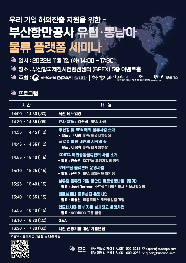 금번 세미나는 BPA가 우리기업 해외 진출 지원을 위해 로테르담, 바르셀로나, 인도네시아 동부 자바 주 등 3개 지역에 확보한 항만 배후 물류센터 이용을 상세히 안내하기 위해 올해 처음으로 부산에서 개최하는 행사이다.