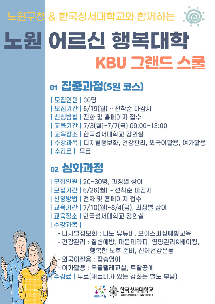 집중과정은 이달 19일, 심화과정은 26일부터 접수를 시작한다. 강좌별 세부사항은 한국성서대학교평생교육원 또는 구청 홈페이지를 참조하면 된다.