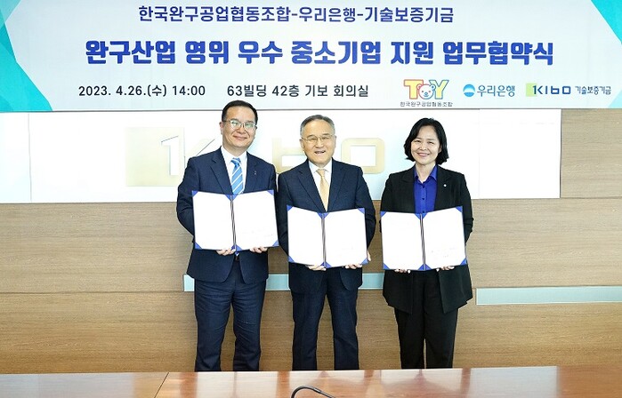 [부산=최성일 기자] 기술보증기금(이사장 김종호, 이하 ‘기보’)과 우리은행, 한국완구공업협동조합(이사장 소재규, 이하 ‘완구조합’)은 26일(수) 기보 서울사무소에서 「완구산업 영위 우수 중소기업 지원을 위한 업무협약」을 체결했다고 밝혔다.