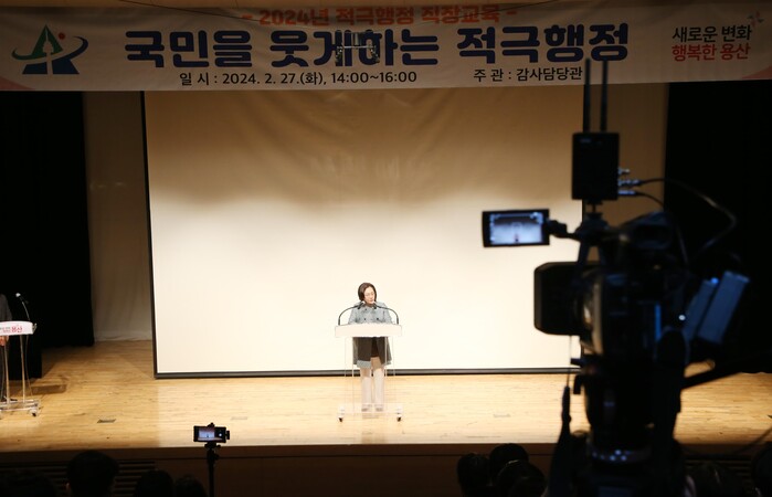 [시민일보 = 여영준 기자] 서울 용산구(구청장 박희영)가 지난 2월27일 용산아트홀 소극장 가람에서 소속 공무원과 용산구시설관리공단 직원을 대상으로 적극행정 직장교육을 실시했다.