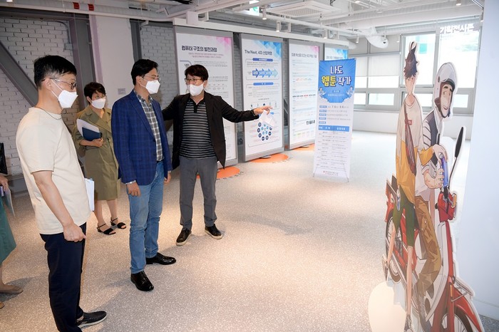 [광주=정찬남 기자] 김광진 광주광역시 문화경제부시장이 23일 오후 전일빌딩 245에서 열린 디지털정보도서관 자료 특성화에 따른 만화(웹툰)코너 신설 행사에 참석해 관계자에게 체험행사에 대한 설명을 듣고 있다. /광주광역시 제공