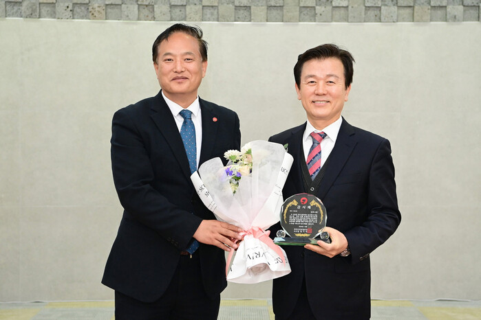 -"조규일 진주시장이 국민건강보험공단 이사장을 대신하여 안문환 진주ㆍ산청지사장에게 감사패를 받고 있다."-