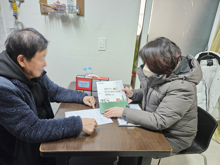 | ▲ 숨은희망찾기사업으로 신규 기초생활 수급가구에 방문한 담당자가 복지혜택 홍보물을 설명하고 있다. (사진=송파구청 제공) |