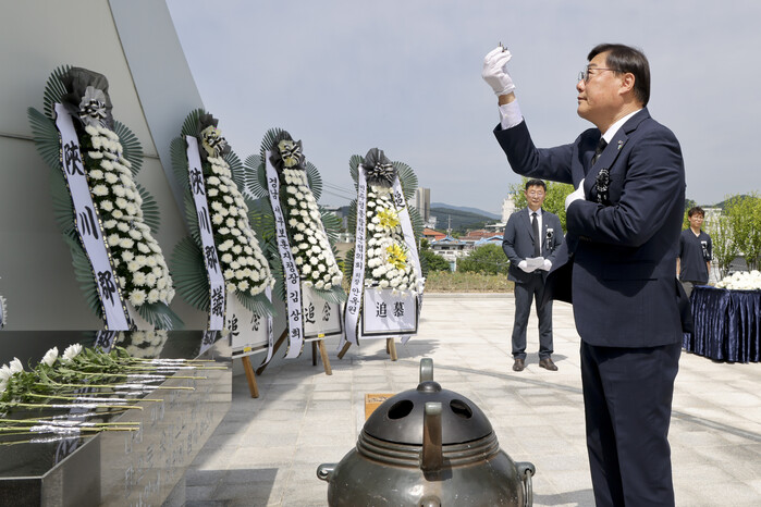 김윤철 군수는 추념사를 통해 “조국을 위해 목숨을 바치신 선열들의 위국헌신(爲國獻身)에 감사드리며, 선열들이 남기신 애국 유산을 밑거름 삼아 희망찬 미래의 합천, 행복한 군민을 이루어 그 공로에 보답하겠다”라고 말했다.