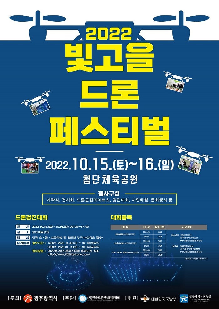 또한, 경진대회는 드론 헌팅배틀대회, 드론게이트대회, 드론 팝드론배틀대회 등 3개 프로그램이 일반부와 학생부로 나눠 32강부터 토너먼트로 진행되며, 우수한 성적을 거둔 참가자에게는 광주시장상과 국방부장관상, 부상을 수여할 예정이다.