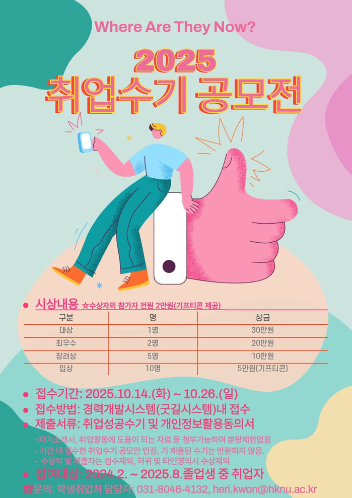 이번 공모전은 재학생과 지역청년들의 진로 및 취업 탐색을 위해 마련된 것으로, 최근 2년 이내 한경국립대를 졸업한 취업자라면 누구나 참여할 수 있다.