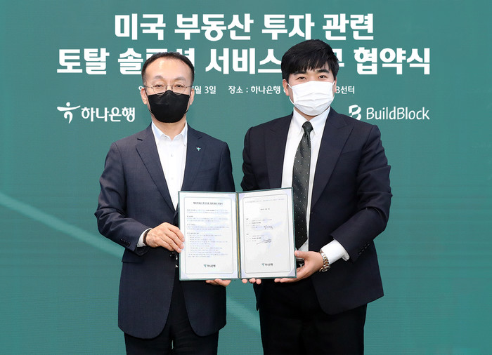[시민일보 = 여영준 기자] 하나은행은 서울 한남동 소재 Club1한남PB센터에서 미국 부동산 투자 플랫폼 기업인 빌드블록과 미국 부동산 투자 관련 토탈 솔루션 서비스 제공을 위한 업무협약을 체결했다고 4일 밝혔다.