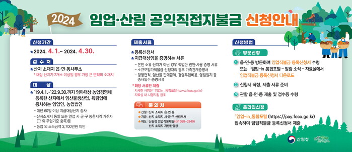 진주시는 4월 1일부터 시작한‘2024년 임업·산림 공익직접지불금(이하 임업직불금)’ 신청·접수를 오는 30일 마감한다.