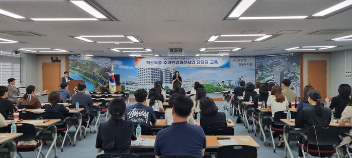 진주시는 14일 시청 문화강좌실에서 읍면동 에너지효율개선사업 및 저소득층 주거환경개선사업 담당자 60여 명이 참석한 가운데 ‘2024년 에너지효율개선사업 연계 저소득층 주거환경개선사업 담당자 교육’을 실시했다.