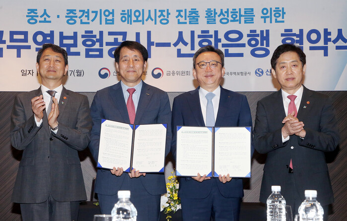 [시민일보 = 이대우 기자] 신한은행(은행장 정상혁)은 17일 서울 중구 소재 더플라자 호텔 서울에서 한국무역보험공사(사장 장영진)와 중소ㆍ중견기업의 해외시장 진출 활성화를 위한 업무협약을 체결했다. 협약식에는 안덕근 산업통상자원부 장관과 김주현 금융위원장이 함께 참석했다.