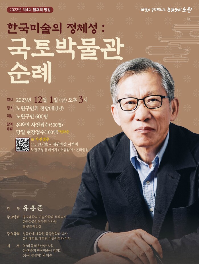 내달 1일 오후 3시 노원구민의 전당에서 진행되는 올해 네 번째 불후의 명강에서는 '한국미술의 정체성: 국토박물관 순례'라는 주제로 미술평론가 유홍준 교수가 강연자로 나선다.