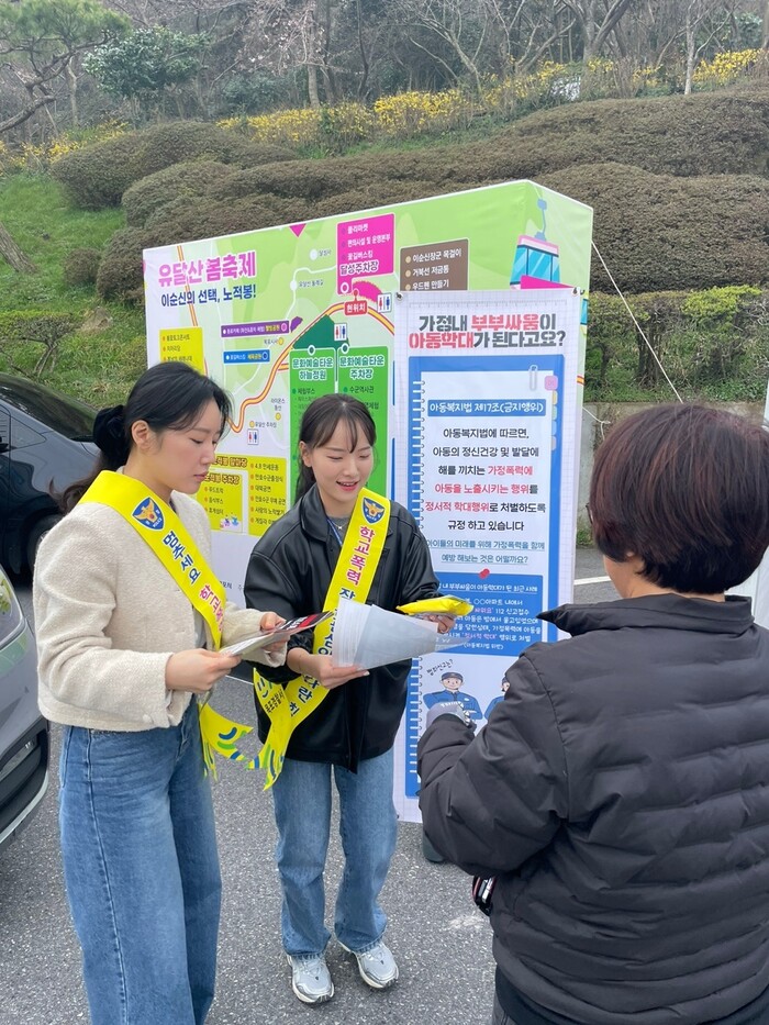 [목포=황승순 기자]목포경찰서(서장 김범상) 여성청소년계는 30일, 유달산 꽃 축제 개막식에 맞춰, 관광객이 많이 몰리는 틈을타, 가정폭력 . 아동학대 . 사이버 성폭력 안전수칙 . 노인학대 대처 방안 등 전단지를 배포하며, 범죄예방 홍보 활동에 나섰다.